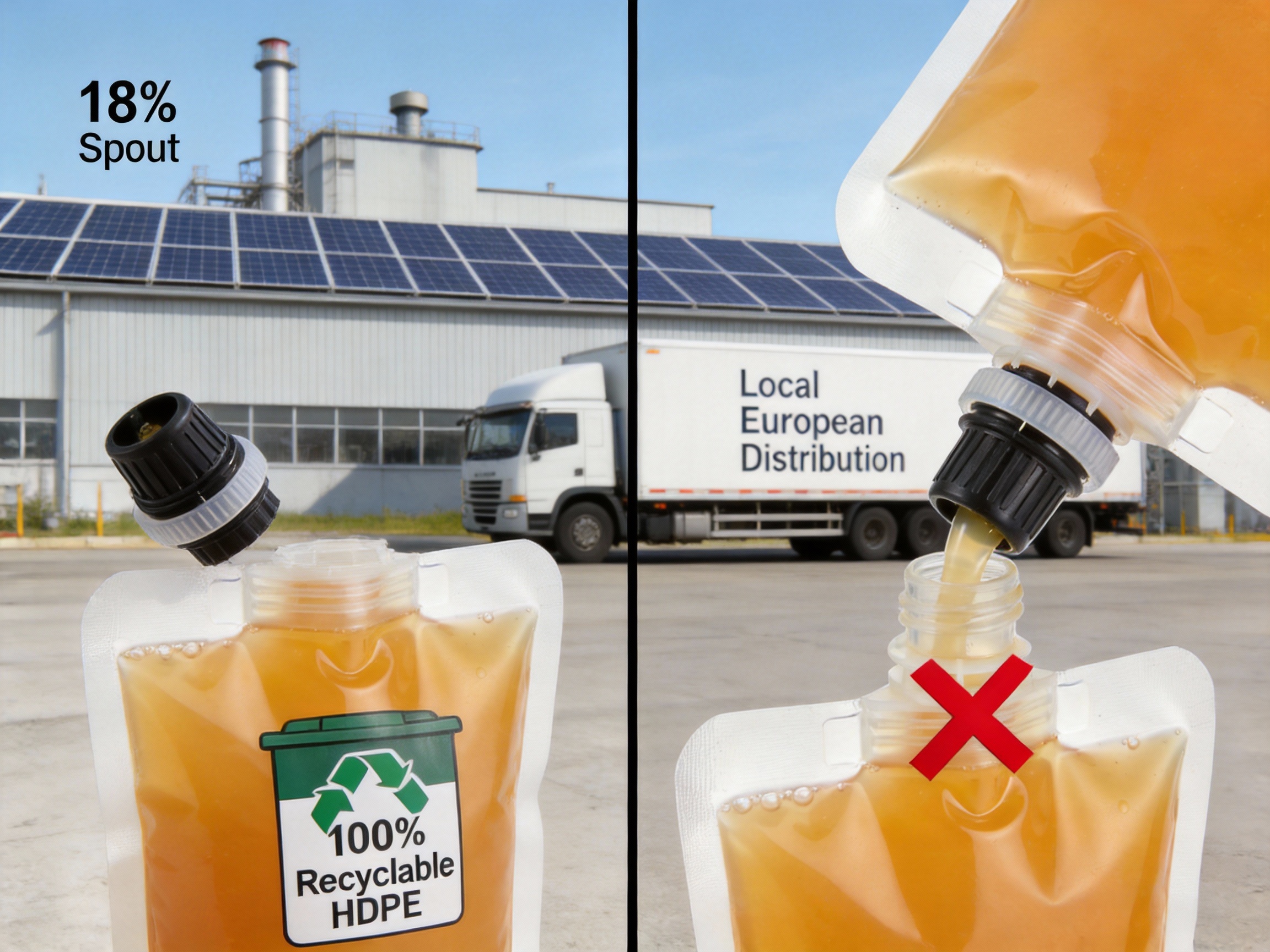 A: Yes. The 18# Spout is made from 100% recyclable HDPE, and its snap-on design allows for easy separation from the bag (no glue required). The manufacturer also offers a take-back program for used spouts, which are recycled into new products. In 2023, 85% of 18# Spouts were recycled, compared to 15% of conventional spouts.