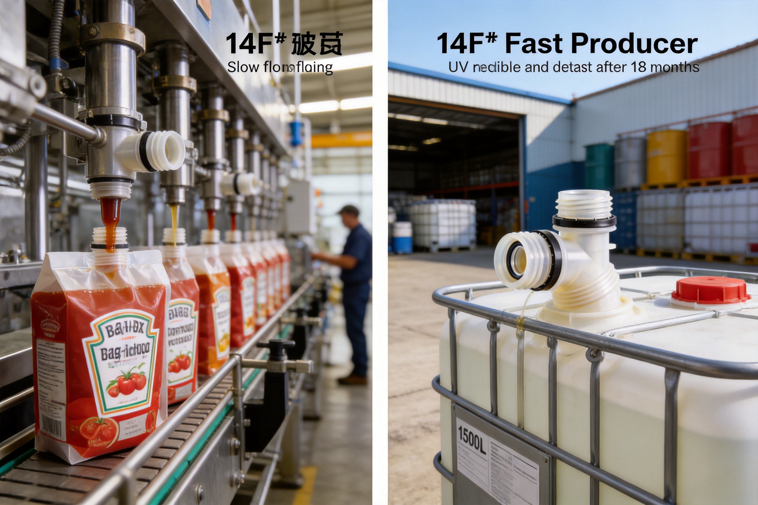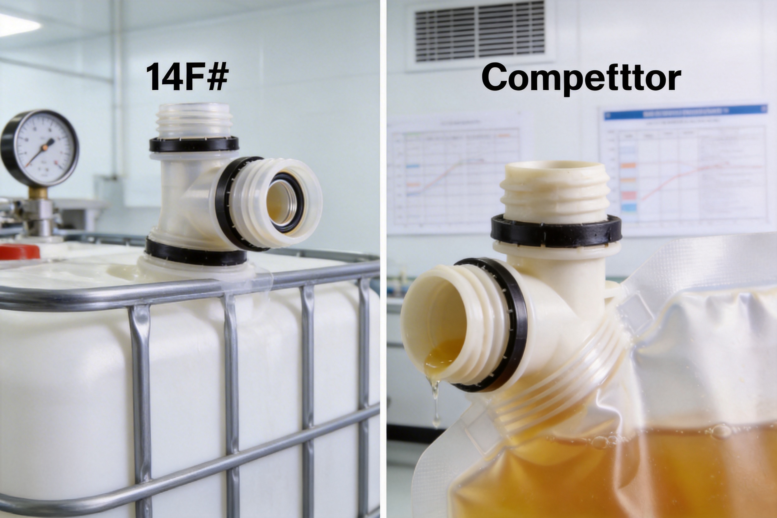 Many competitor spouts are designed for specific packaging types or sizes, limiting their utility for businesses with diverse product lines. The 14F# spout, however, is compatible with 1L to 1500L packaging, including aseptic bags, IBC liners, bag-in-box, FIBC liners, and stand-up pouches. This versatility allows businesses to standardize their fitment procurement, reducing inventory costs and simplifying supply chain management.